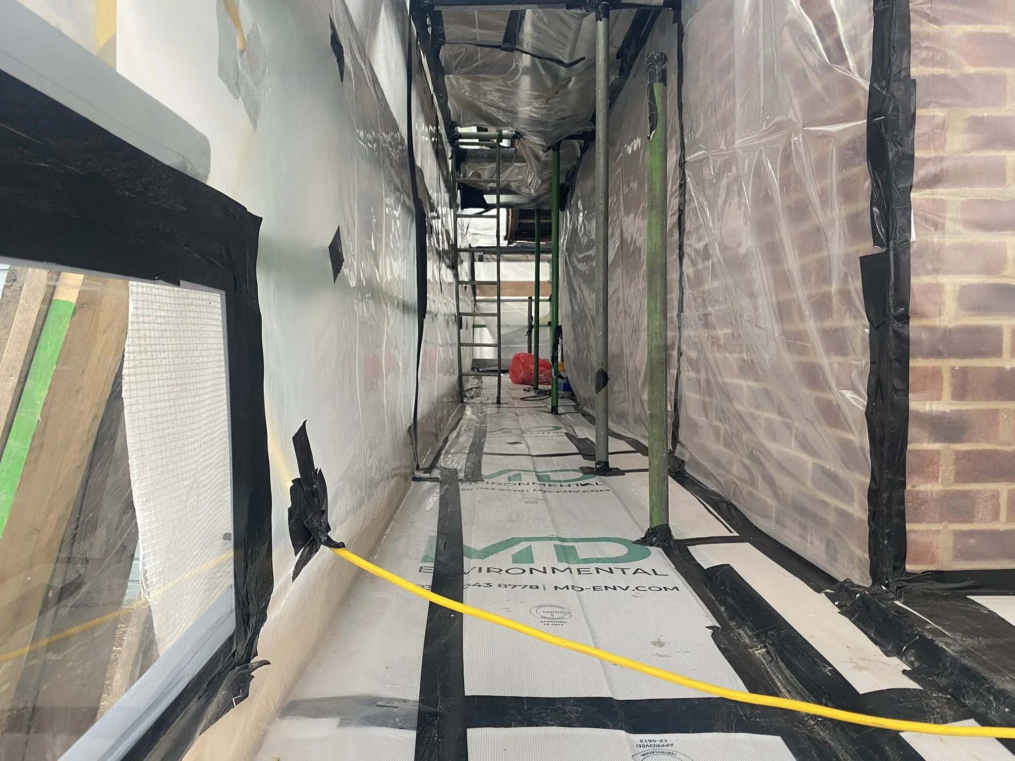Following the required 14-day notification to the Health and Safety Executive (HSE), we mobilised on-site as scheduled and in line with the overall project programme. The asbestos-containing materials identified in the pre-demolition survey included external soffits and fascias, which necessitated full enclosure.